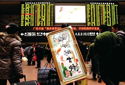 今年春运第一天,在西客站内,一位返乡人身上背着“家和万事兴”的牌匾回家,与父母妻儿团聚。(资料图片)本报记者胡雪柏摄