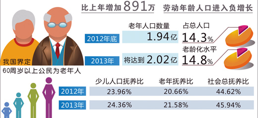 老龄办副主任兼中国老龄科学研究中心主任吴玉韶介绍,随着1952年和1953年出生的人口进入老年期,中国迎来了第一个老年人口增长高峰,60岁以上老龄人口达1.94亿人。老年人口的高龄、失能(生活不能自理)和空巢化将进一步加剧应对人口老龄化的严峻性和复杂性。截至2012年底,80岁及以上高龄老年人口达2273万人,失能老年人口3600万人,慢性病患病老年人口0.97亿人,空巢老年人口0.99亿人。2025年之前,高龄老年人口将保持年均增长100万人。